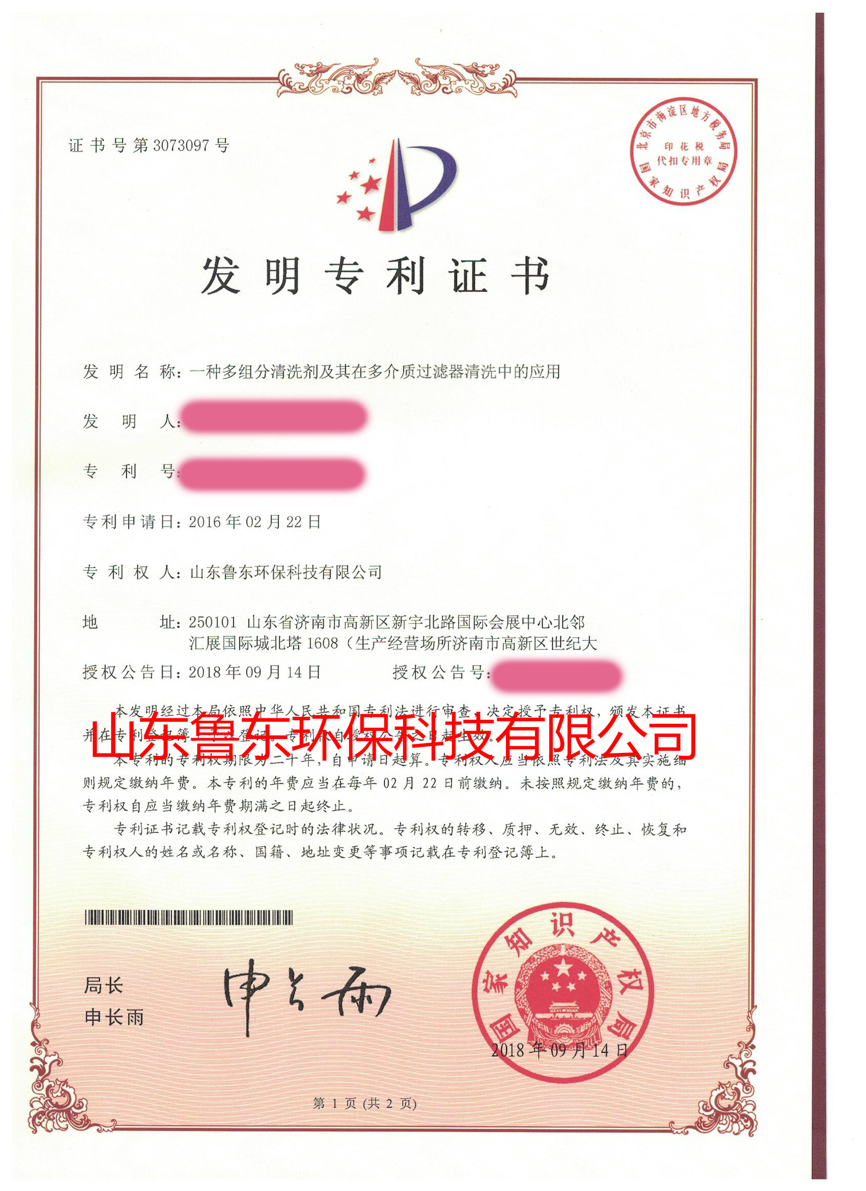 該專利為山東魯東環(huán)??萍加邢薰炯夹g研發(fā)團隊自主研發(fā)的成果,體現(xiàn)了公司在水處理藥劑行業(yè)創(chuàng)新能力進一步提高,更體現(xiàn)了公司一直以來對水處理藥劑品質(zhì)的不斷追求。
